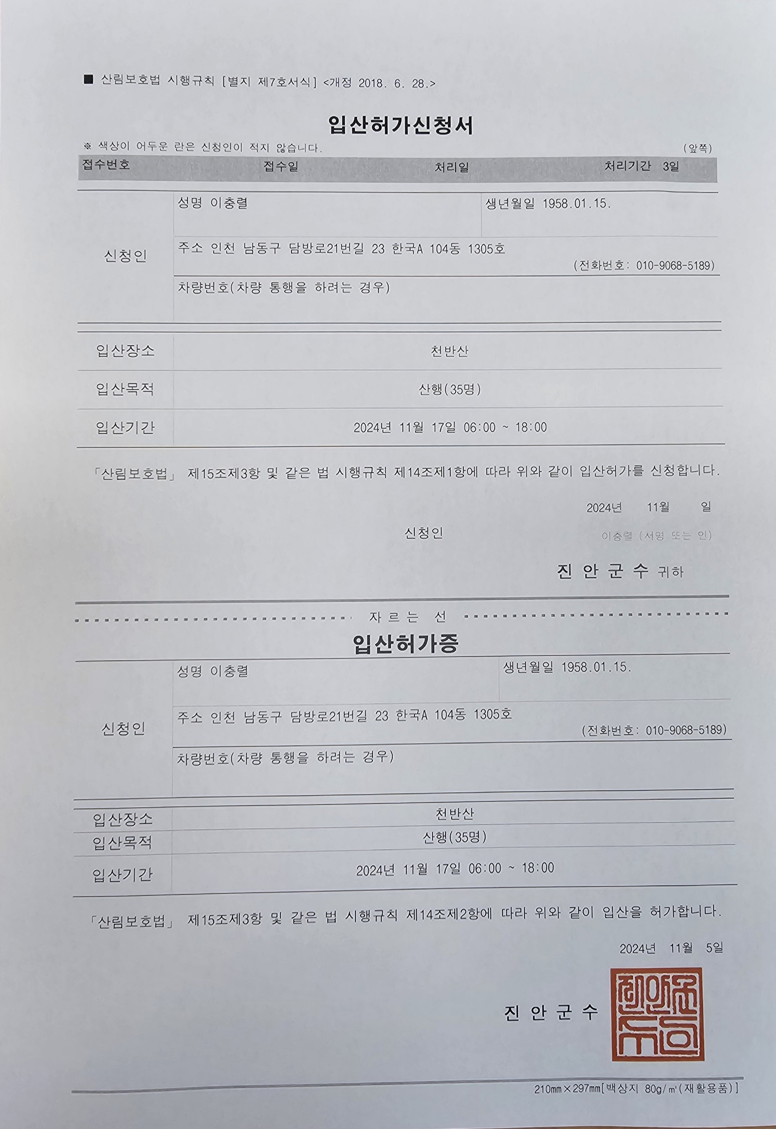 입산금지로 진안군청 입산허가증발급